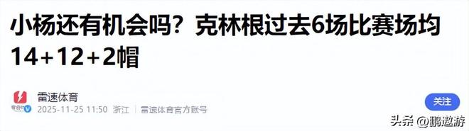 雷速体育(小杨还有机会吗?克林根过去6场比赛场均14+12+2帽2025.11.25)